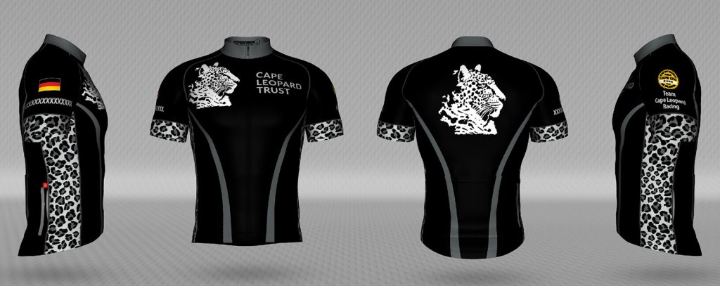Beim Design war uns wichtig, dass gut zu erkennen ist, dass wir für den Cape Leopard Trust fahren. Daher das Logo des Trusts auf der Brust und das Leoparden Muster an den Armen und auf den Seiten.
